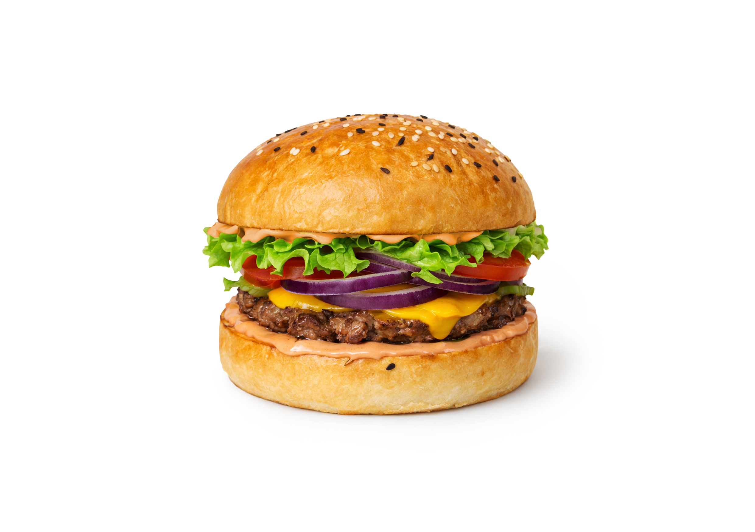 Авторский бургер c сочной говяжьей котлетой на гриле, мягкой булочкой, расплавленным сыром чеддер, хрустящим луком и фирменным соусом. Насыщенный вкус c выразительной текстурой
