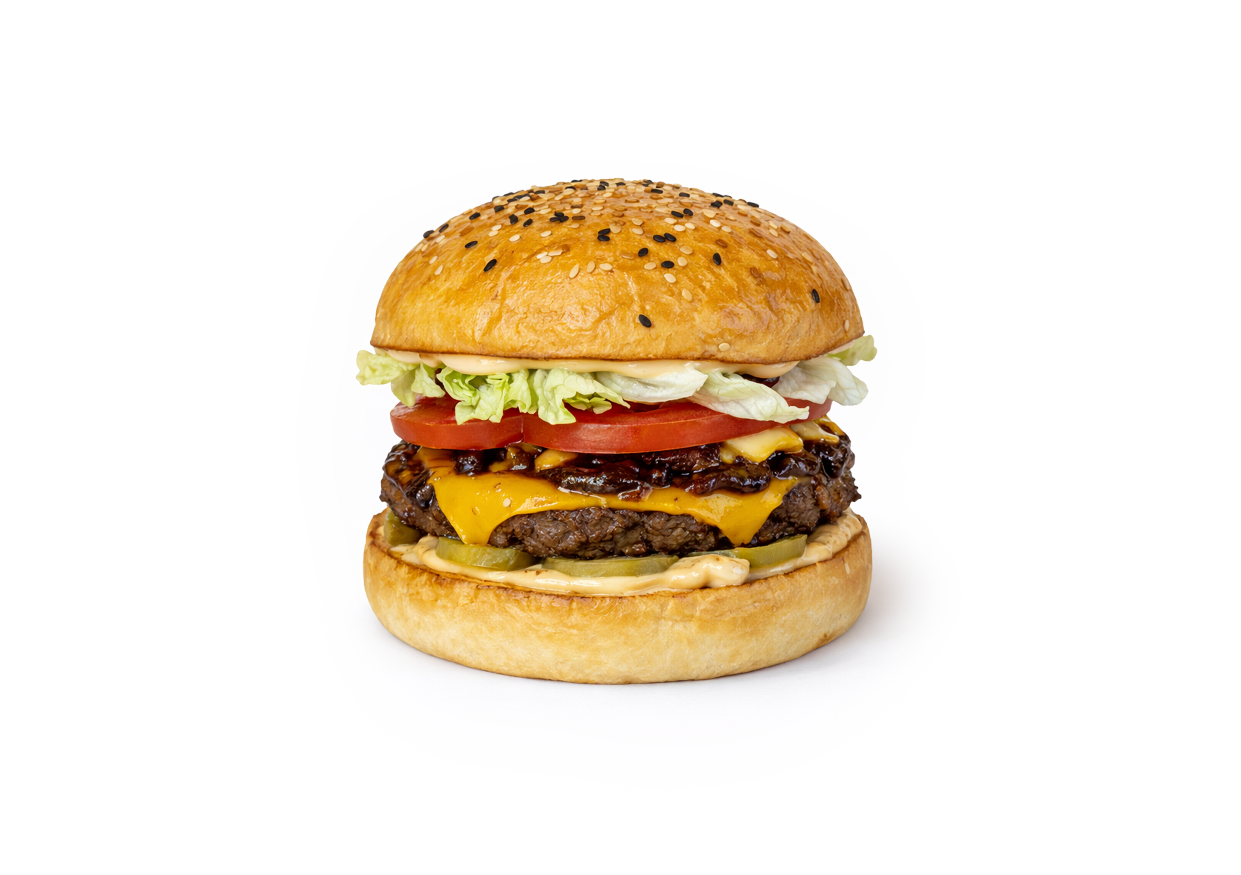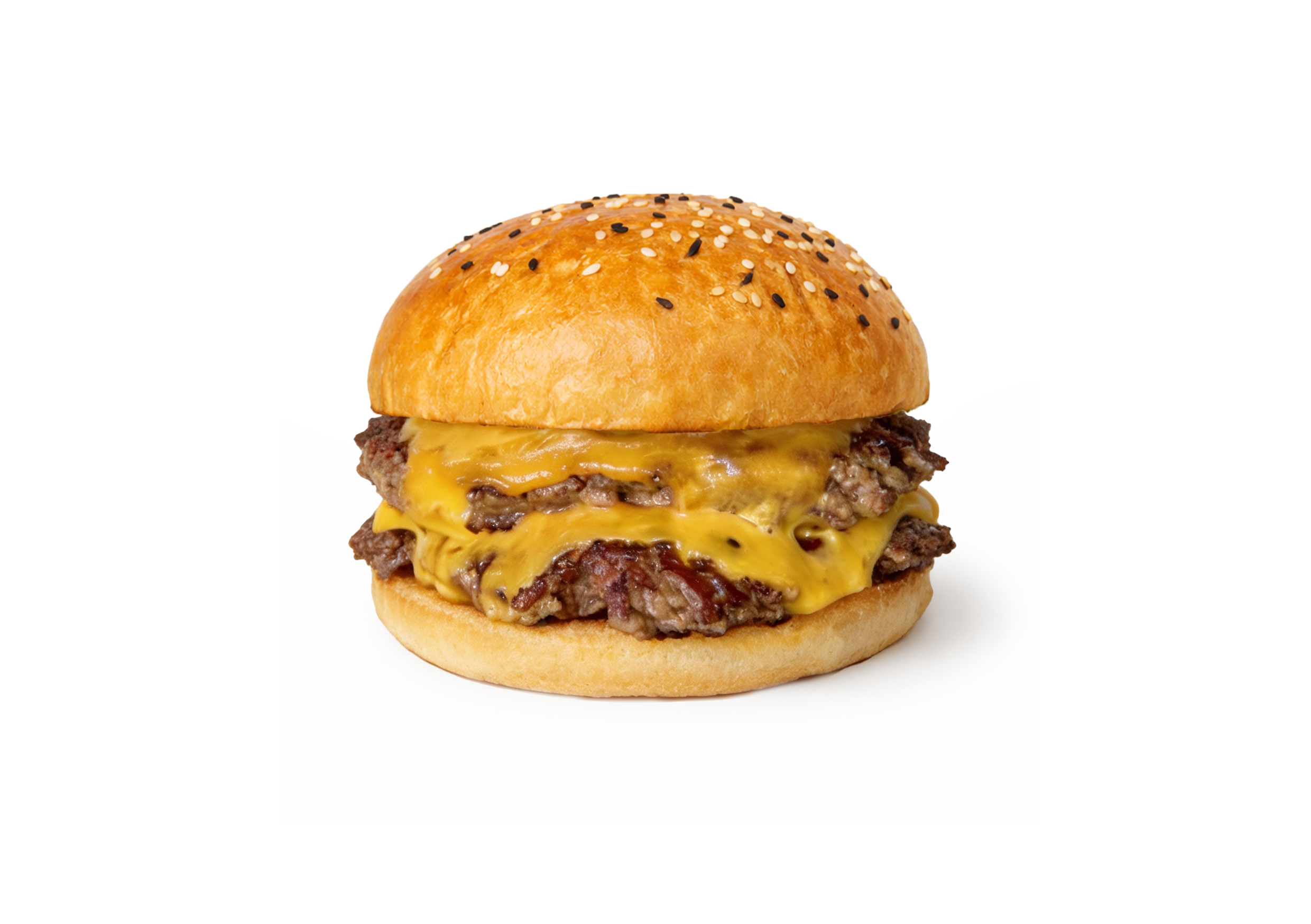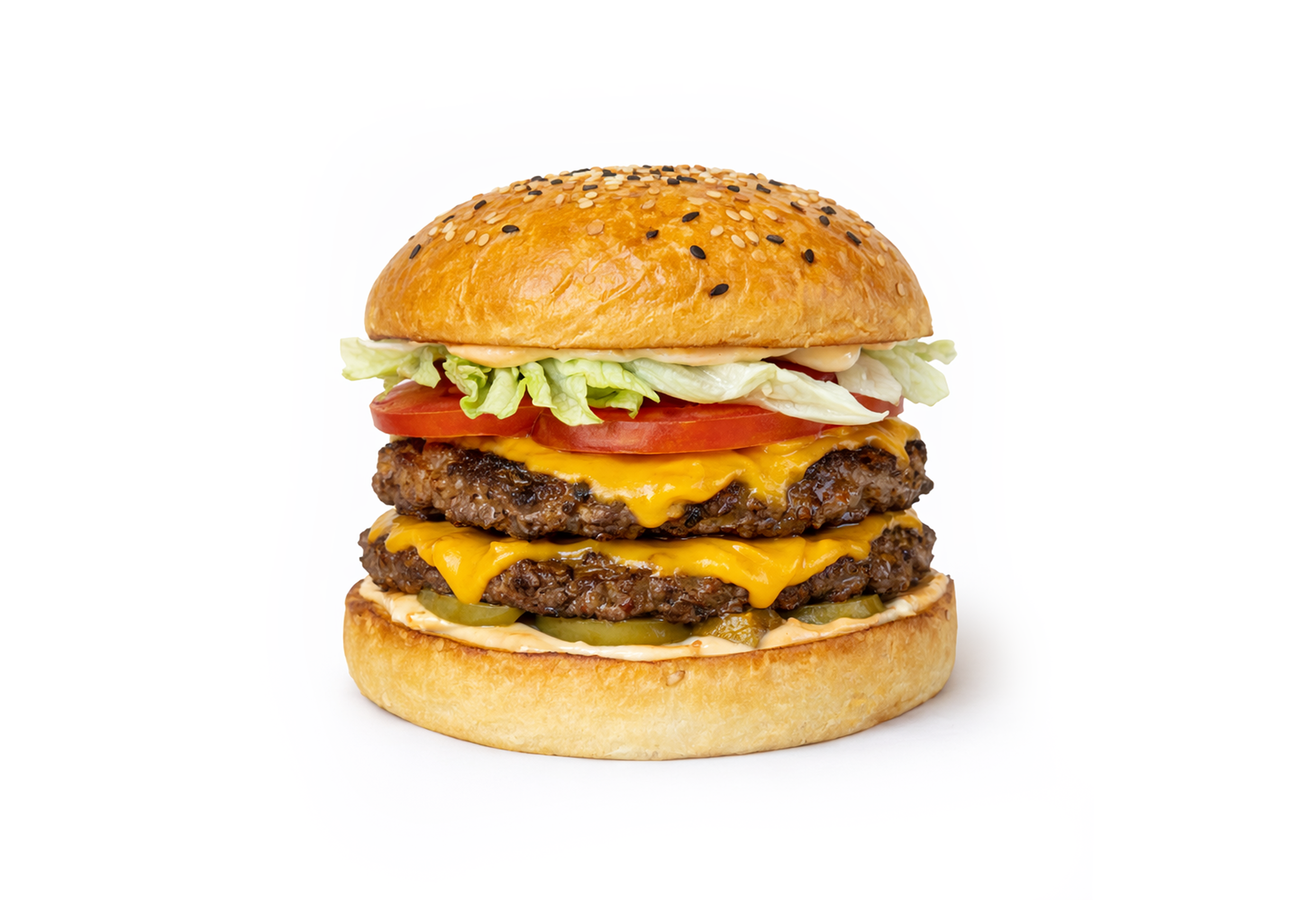 Бургер c двумя сочными котлетами в центре. Булочка хрустящая снаружи и мягкая внутри. Соусы и овощи добавляют вкусу насыщенности и свежести. Текстура контрастная — хрустящая снаружи и нежная внутри. Двойной бургер — очень сытный и аппетитный перекус
