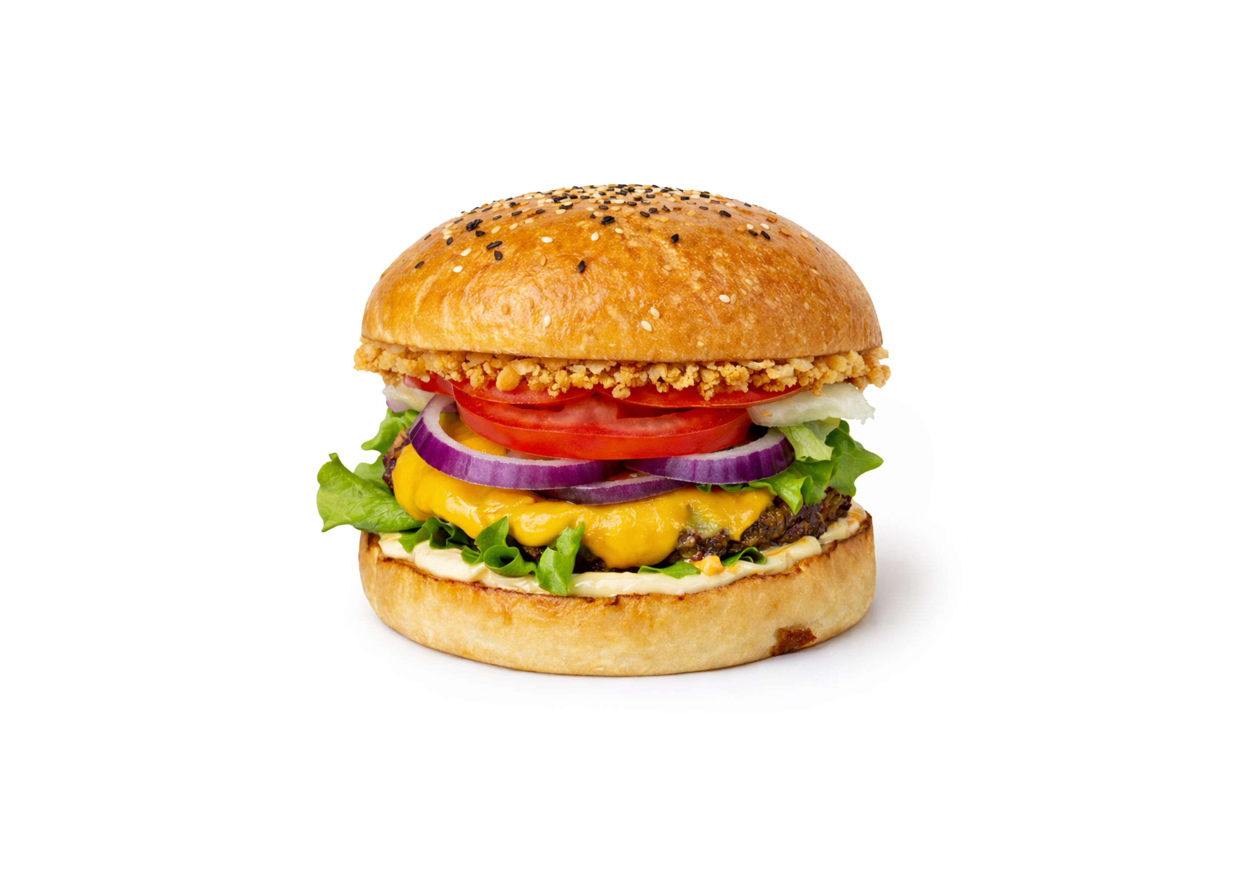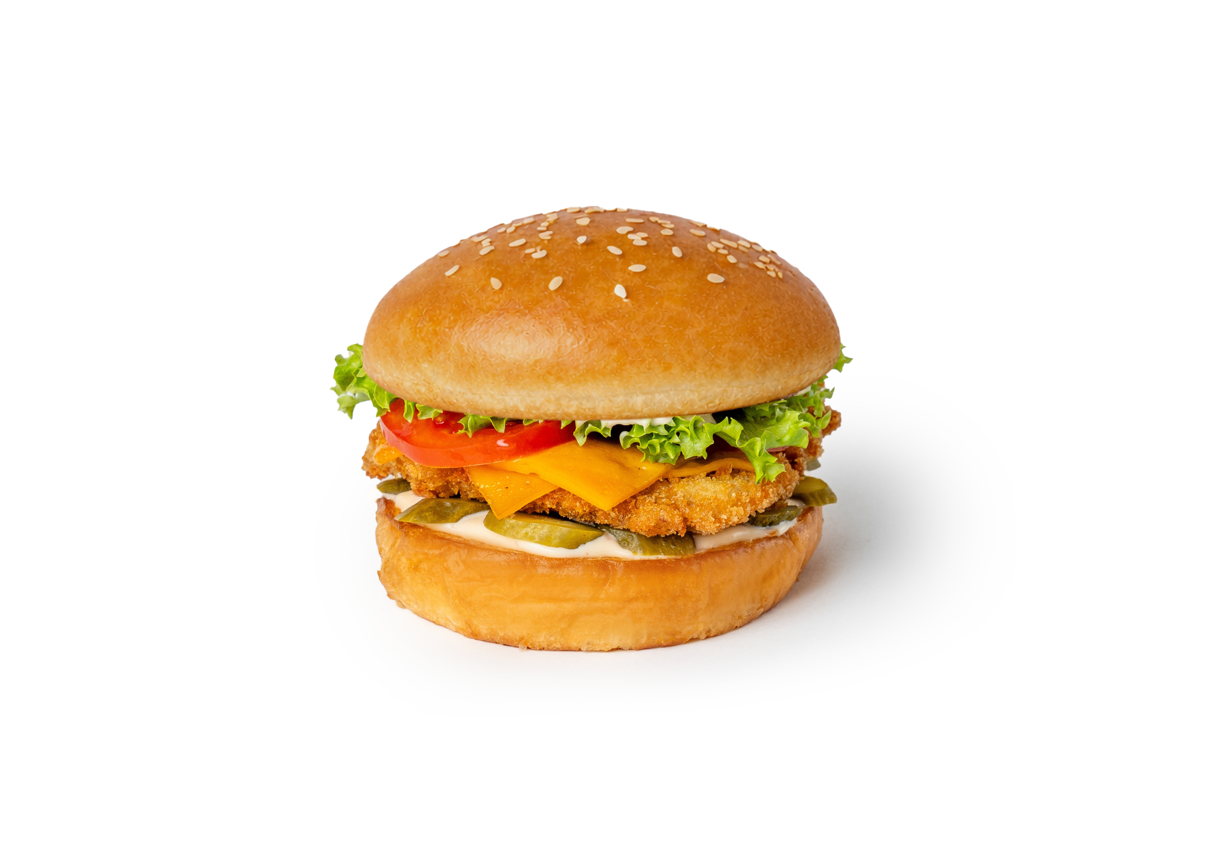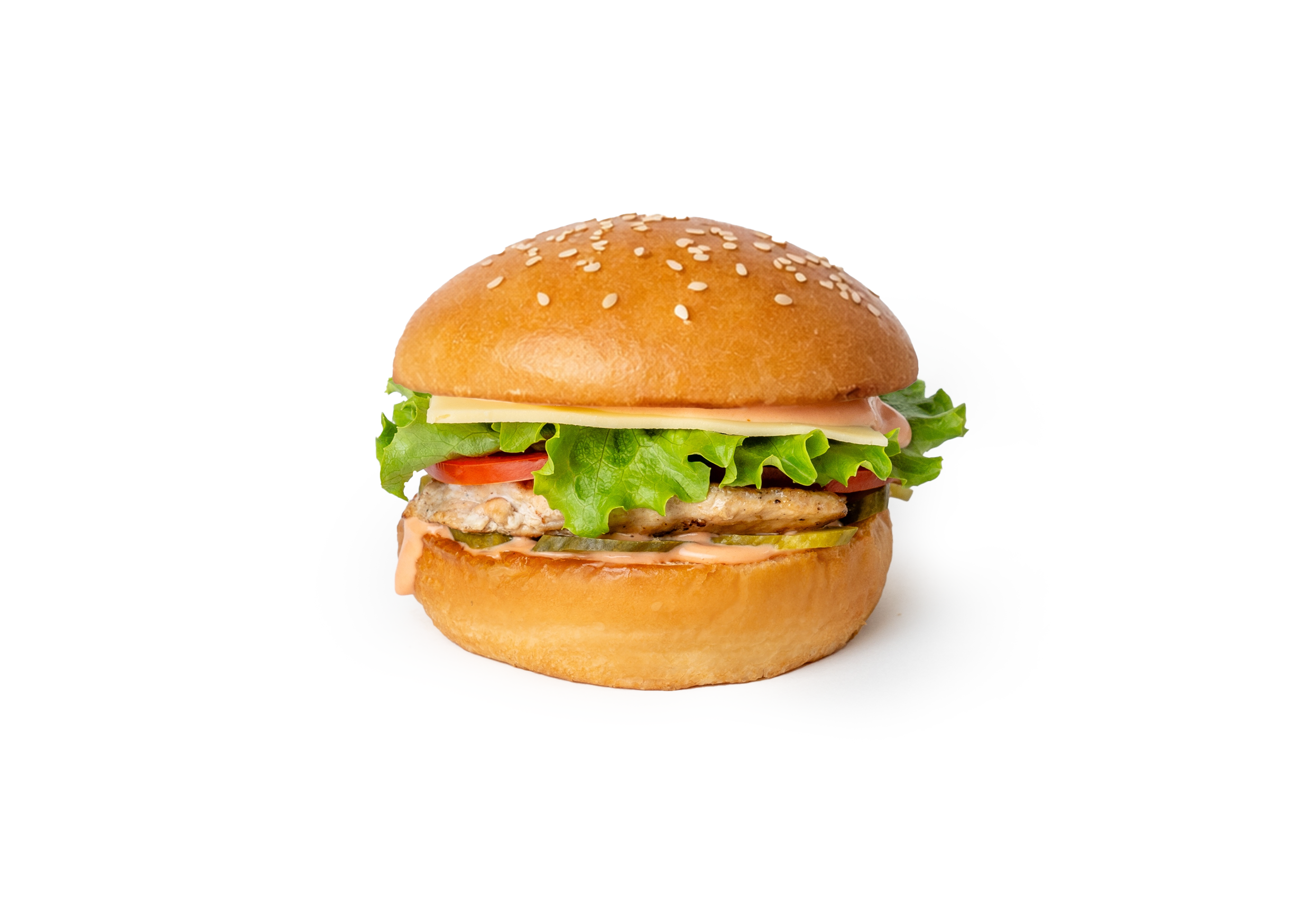 Сочная куриная котлета, мягкая булочка c кунжутом, расплавленный сыр, свежие овощи и фирменный соус. Нежный сырный вкус и сытная порция
