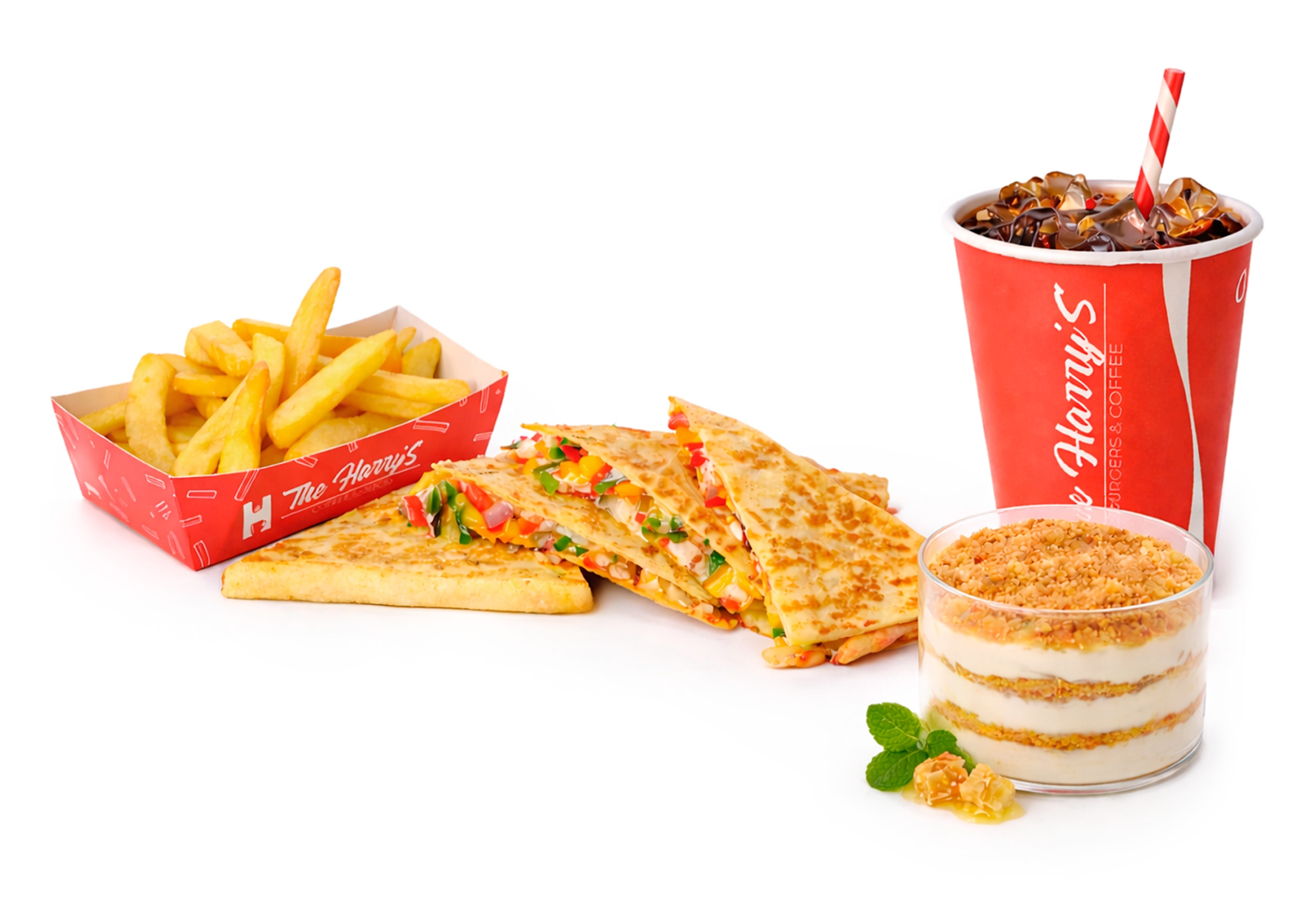 Сытная кесадилья c курицей, сыром и овощами, обжаренная до золотистой корочки. Подаётся c хрустящим картофелем фри, охлаждённой колой и нежным десертом трайфл «Медовик» c кремом и медовыми слоями. Отличный комбо-набор для полноценного приёма пищи