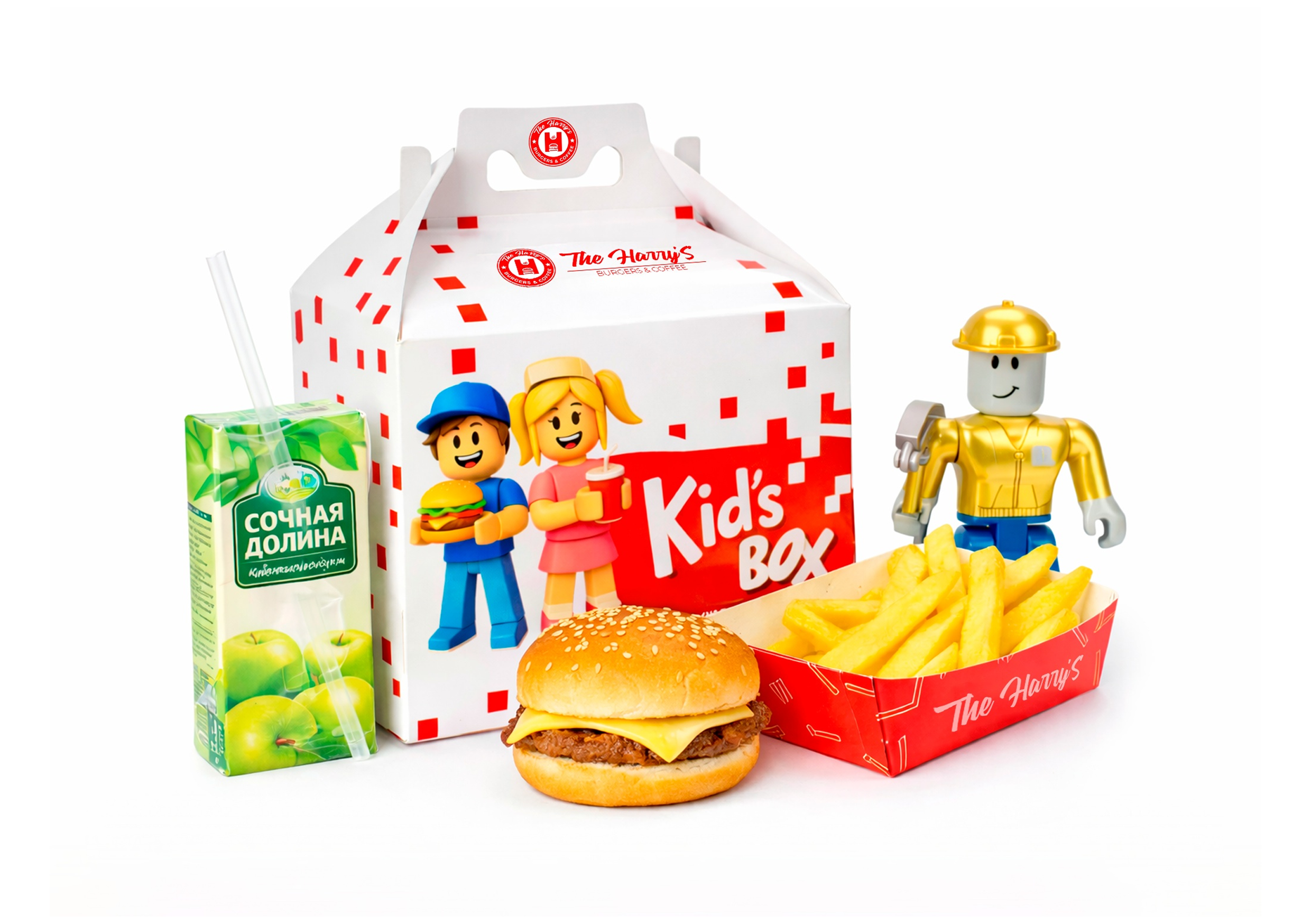 Детский набор c мини-бургером из сочной говяжьей котлеты и сыра в мягкой булочке, порцией хрустящего картофеля фри, яблочным соком и игрушкой-сюрпризом в коробке. Игрушка выбирается случайным образом