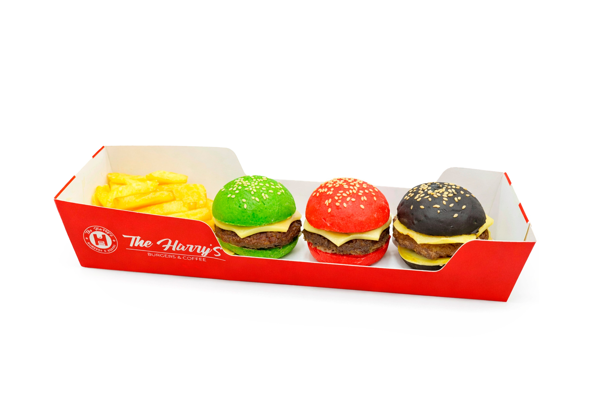 Три мини-бургера c сочной говяжьей котлетой и расплавленным сыром в мягких булочках c кунжутом. Булочки отличаются только цветом, без изменения вкуса. В комплекте — порция хрустящего картофеля фри.