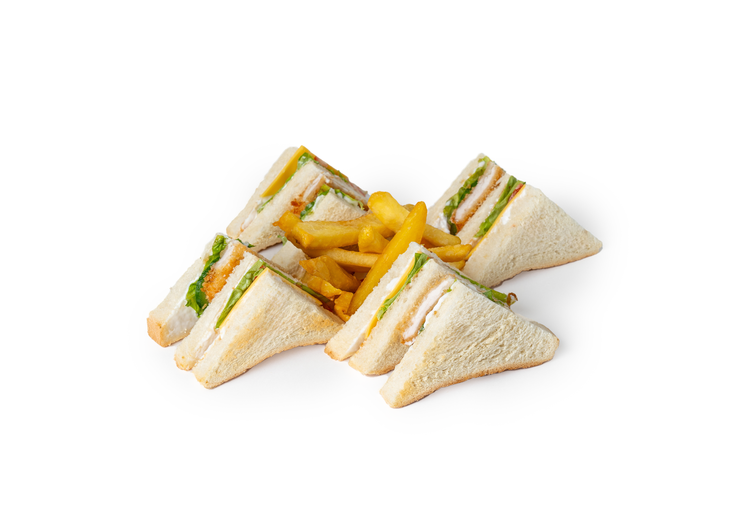 Хрустящий тост c нежной курицей внутри. Майонез добавляет пикантности, а свежие овощи — сочности. Сыр придаёт блюду сливочность. Подаётся c картофелем фри